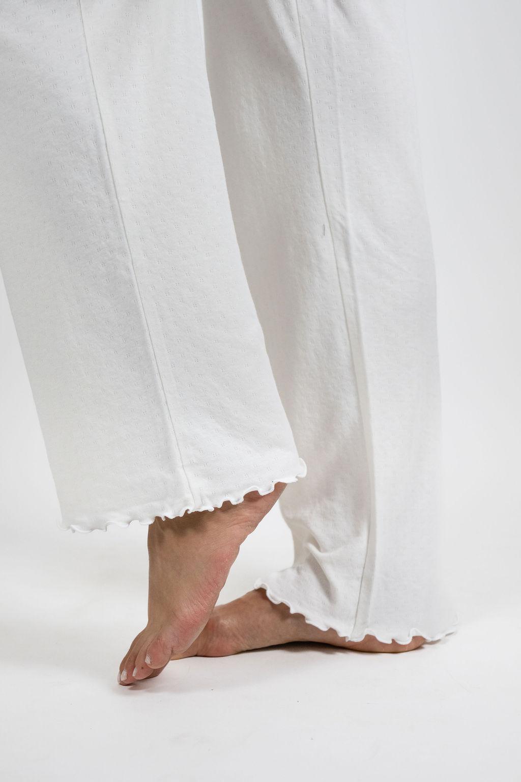 Cotton Jacquard Long Set in Black is a two-piece women’s loungewear set featuring a long sleeve top with a soft scoop neckline and delicate lettuce-edge detailing, paired with full-length wide-leg pants. The pants include a comfortable elastic waistband, side pockets, and subtle lettuce-edge cuffs for an easy, polished finish.